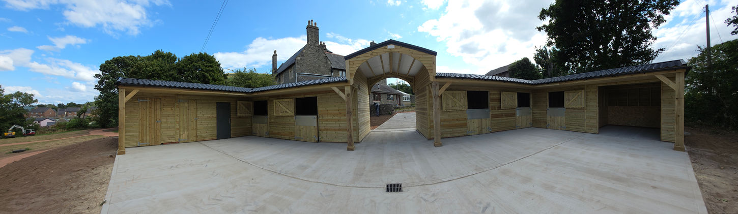 This building was built in the summer of 2025 in South Wales, approximately taking the team 4 days to install the timber structure on a pre prepared concrete base. This Yard has a whole list of extras which set this building apart from anything else like it, including the heavy duty 175mm support posts, all the timber used in this build is pressure treated and all timber used is set off the concrete to avoid moisture soaking up into the sole plates of the building prolonging the life of this building even further. it was a real pleasure assembling this building for our clients who couldnt wait to get the horses inside and out of the heat! the arch way is a great detail and makes a lovely feature to entre and exit the yard, it also doubles up as a wash bay with hot water shower fitted with all pipes hidden in the walls.